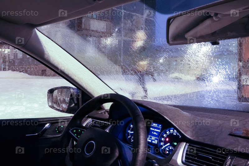 Припаркованный автомобиль без водителя во дворе в зимний вечер. Вид из салона машины