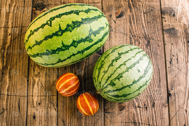 Ассорти из различных видов дынь и арбузов на деревянной поверхности