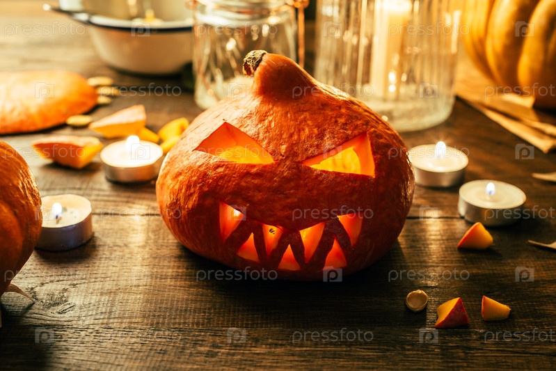 Вырезанная тыква на деревянной поверхности. Фонарь из тыквы (светильник Джека), который является главным символом Хэллоуина