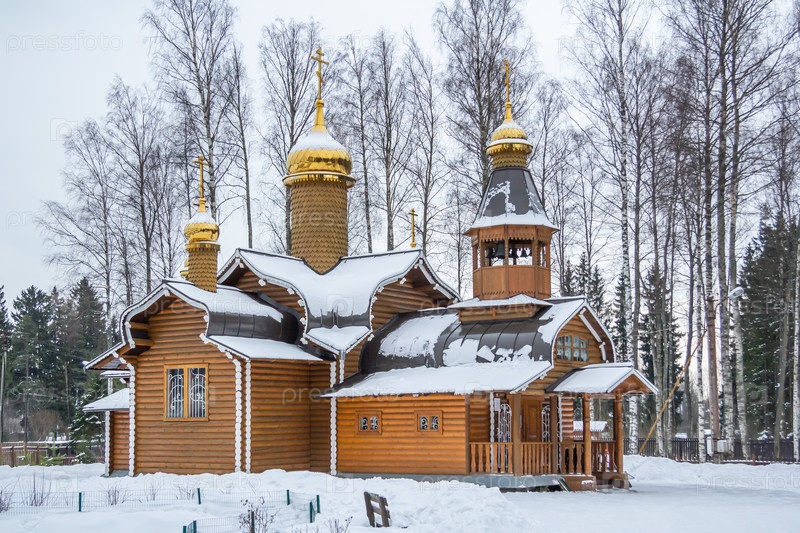Деревянная Церковь Бориса и Глеба с золотыми куполами в зимний день