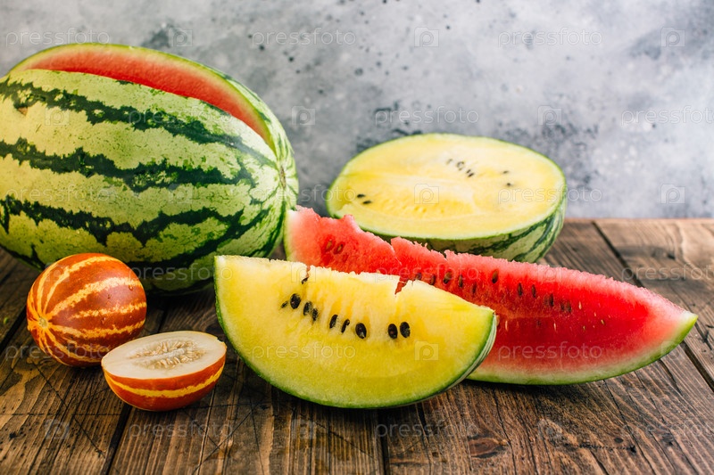 Ассорти из различных видов дынь и арбузов на деревянной поверхности