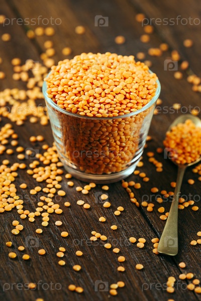 Чечевица в прозрачном стеклянном стакане и рассыпана на столе