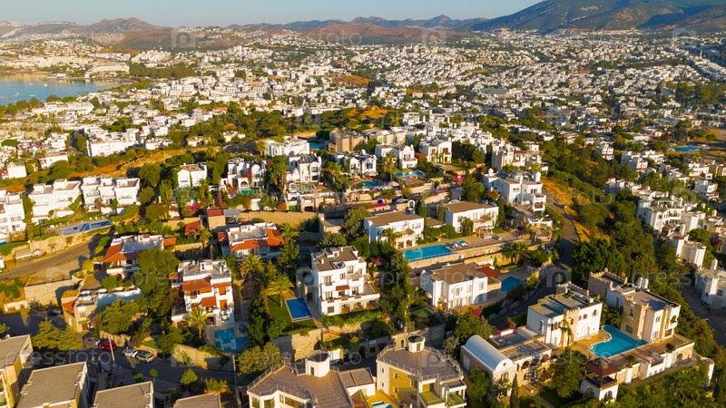 Дронный полет над белыми плоскими крышами домов возле древних городских стен Галикарнасса, зеленых деревьев и городского пейзажа Бодрума