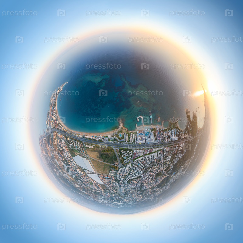 Авсаллар, Аланья, Турция.Маленькая планета стереографическая проекция залива при закате солнца, пляжи, гостиницы и береговая линия завернуты в сферу.Панорамный астероид 360 градусов