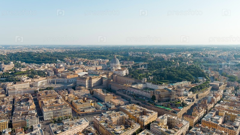 Рим, Италия. Вид на Ватикан. Базилика Сан-Пьетро, Пьяцца Сан-Пьетро. Полет над городом. Вечернее время, Aerial View