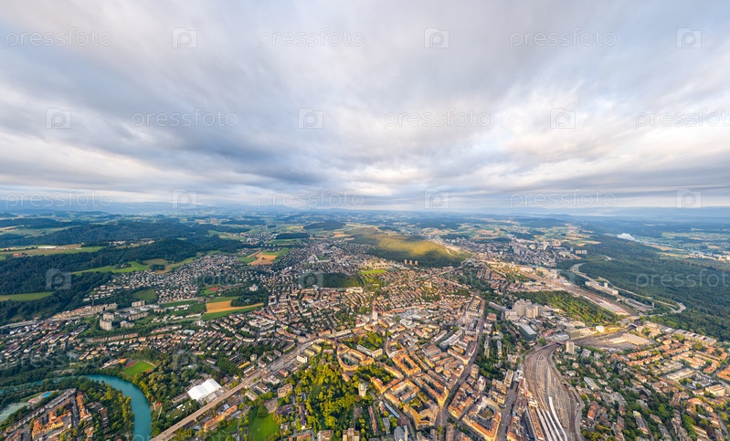 Берн, Швейцария.Панорама города в пасмурную погоду.Солнечные лучи.Летнее утро.Вид с воздуха