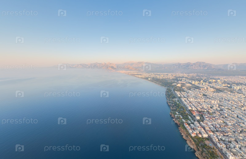 Анталия, Турция.Перспектива из воздуха современного прибрежного курортного района с пляжами, отелями и набережной вдоль бирюзового Средиземного моря.Вид с воздуха