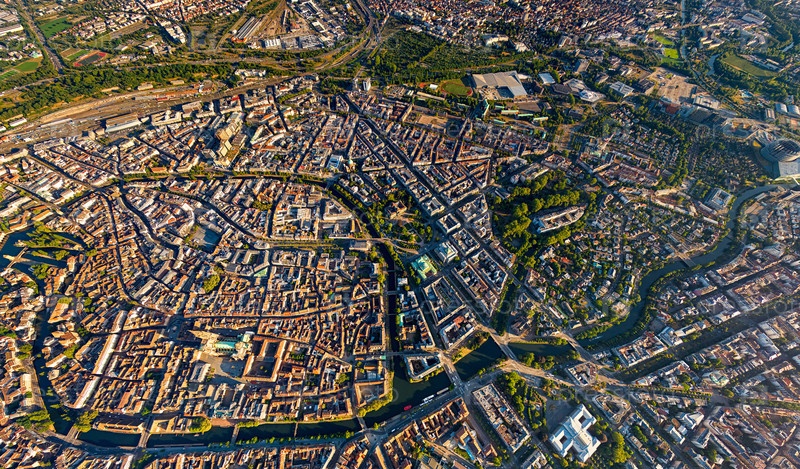 Страсбург, Франция.Панорама города летом утром.Солнечная погода.Вид с воздуха