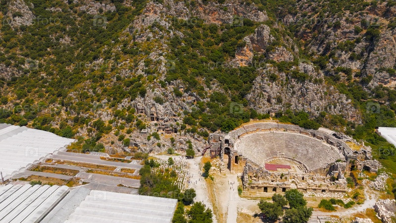 Огромные белые тепличные поля на переднем плане с древними ликийскими скальными могилами и римским театром, высеченным в скале под летним солнцем