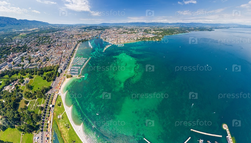 Женева, Швейцария. Фонтан Дже-Дэу. Женевское озеро. Панорама летом. Вид с воздуха
