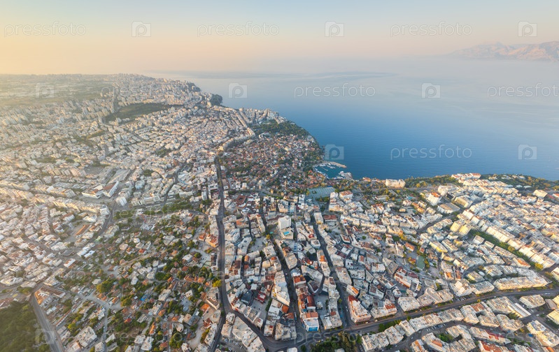 Вид с воздуха на исторический район Калейчи, расположенный между морем и современным городом, подчеркивая его уникальное положение как древнего острова в современной обстановке