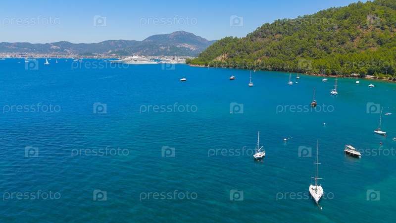 Панорама из воздуха залива Мармарис с крутыми лесистыми склонами, скалистыми скалами, яхтами и пляжами.Природный пейзаж турецкого средиземноморского побережья.. Aerial View Marmaris