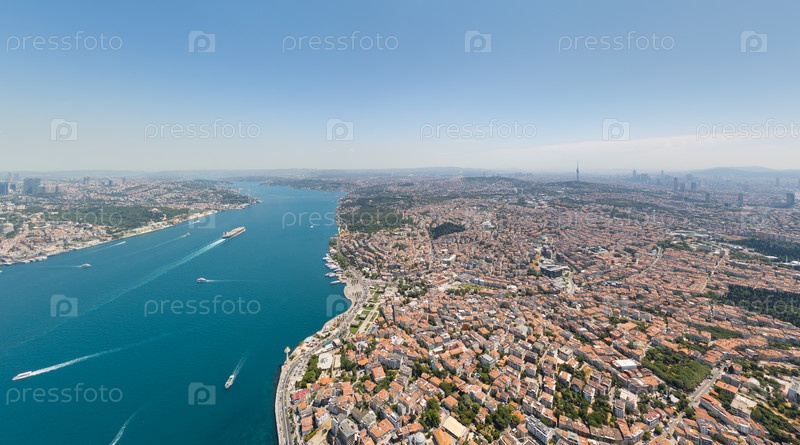 Стамбул, Турция.Ускударский район на азиатском берегу Босфора с интенсивным морским движением в проливе.Панорамный вид из воздуха жилого района и водного пути в летний полдень.Восхождение