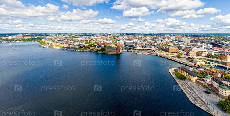 Стокгольм, Швеция. Стокгольмская ратуша. Панорама города летом в пасмурную погоду. Вид с воздуха