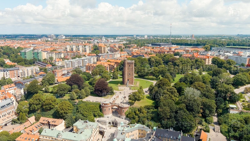 Хельсингборг, Швеция. Карнан - сохранившаяся 35-метровая башня средневекового замка. Летний день. Облачная погода, Aerial View