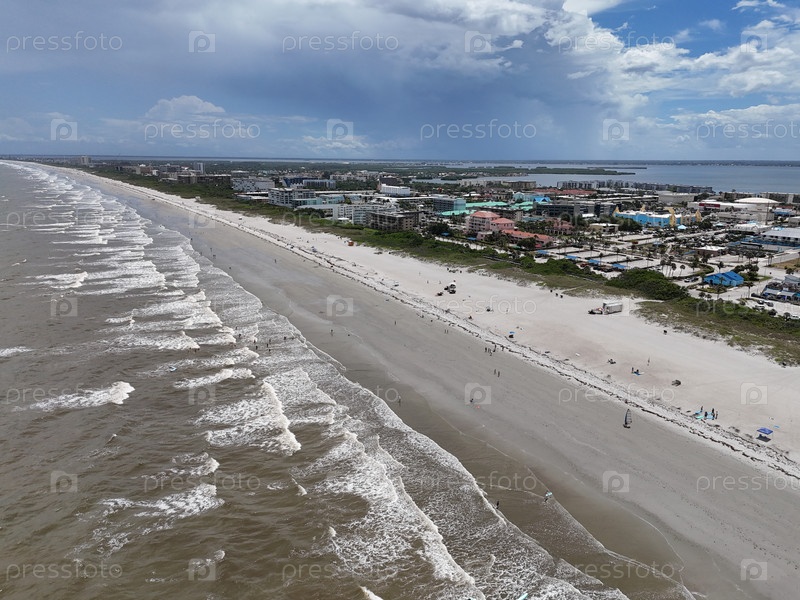Вид с воздуха на Кокао-Бич и береговую линию мыса Канаверал, штат Флорида, побережье Атлантического океана и пирс. g