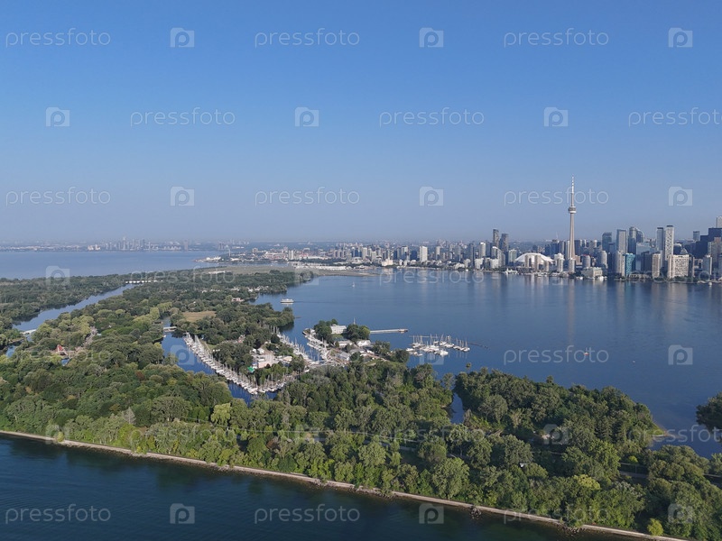 Горизонт Торонто с CN Tower, набережной и остров Торонто в озере Онтарио, панорама городского пейзажа из воздуха, Канада. g