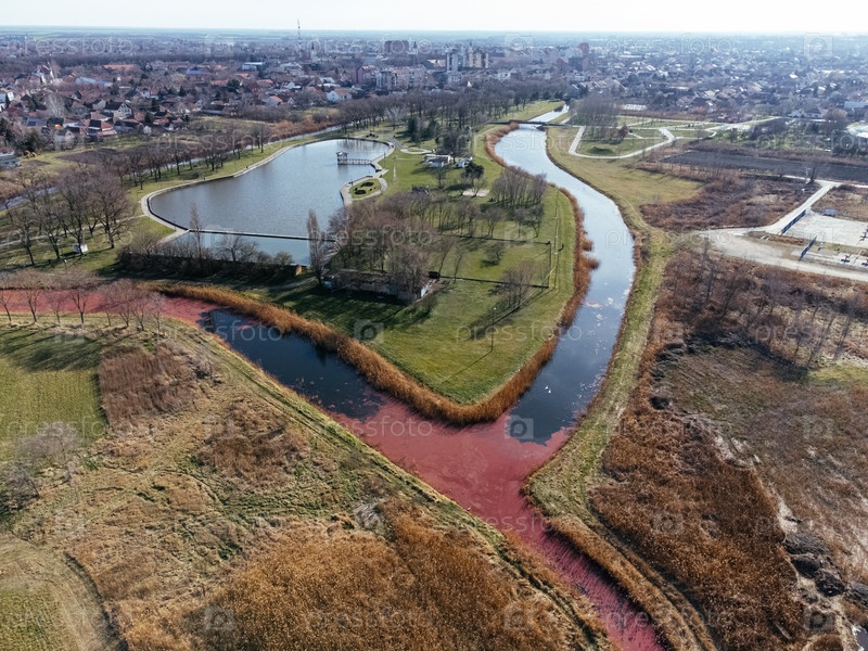 Вид с беспилотного летательного аппарата парка Кикинда с озером и каналами, жилым районом и полями, Сербия.Staro Jezero, Kikinda, Европа. g