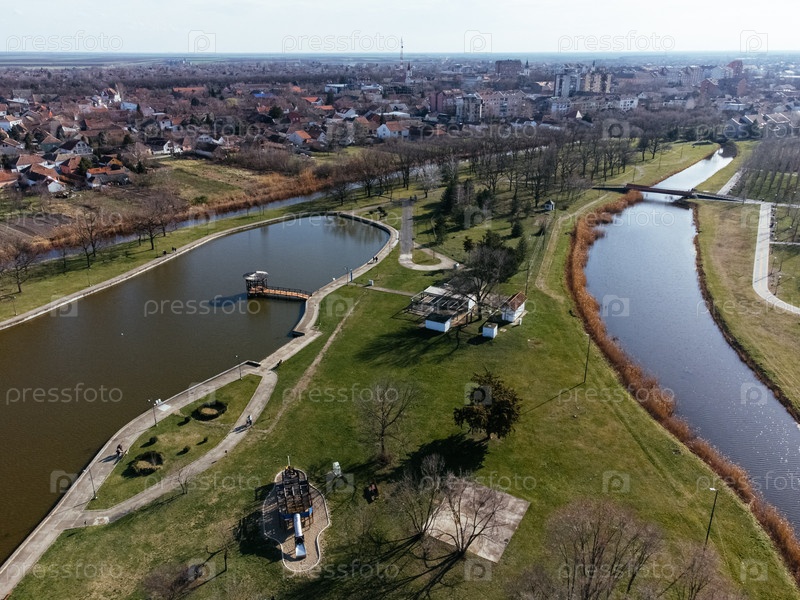 Вид с беспилотного летательного аппарата парка Кикинда с озером и каналами, жилым районом и полями, Сербия.Staro Jezero, Kikinda, Европа. g