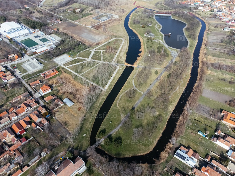 Вид с беспилотного летательного аппарата парка Кикинда с озером и каналами, жилым районом и полями, Сербия.Staro Jezero, Kikinda, Европа. g
