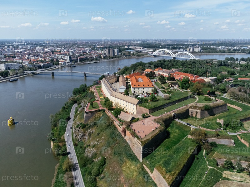 Зональный снимок с дронов крепости Петроварадин, расположенной на берегу реки Дунай напротив Нови-Сада. Сербия