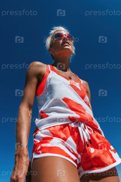 Модные модницы демонстрируют смелые стили и шикарные солнцезащитные очки, установленные на красивом чистом небе над ними