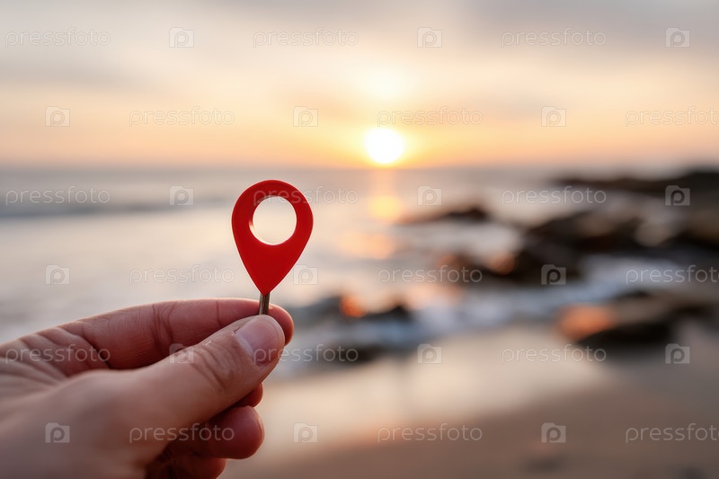 Рука без усилий держит ярко-красную вывеску расположения у океана, а красивый вид на закат солнца улучшает сцену