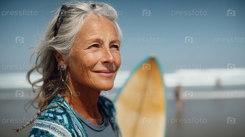 Веселая пожилая женщина отлично проводит время, занимаясь серфингом на пляже, ярко демонстрируя свой активный и динамичный образ жизни