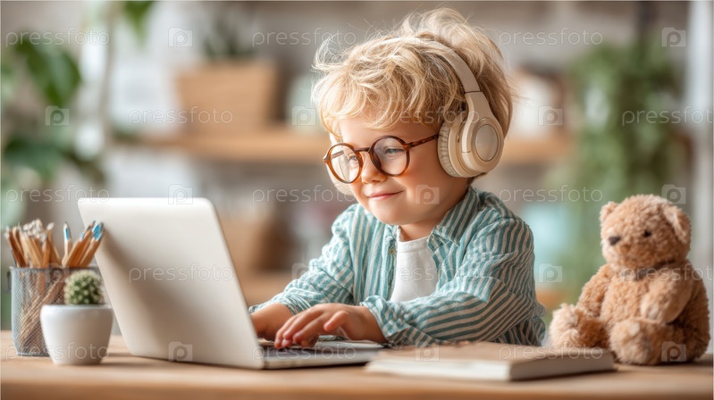 Радостный ребенок счастливо наслаждается музыкой дома, используя ноутбук для развлечений и веселых мероприятий
