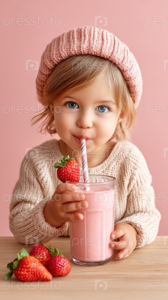 Очаровательная девушка радостно держит вкусный клубничный смузи с яркой улыбкой, идеально подходит для маркетинговых целей
