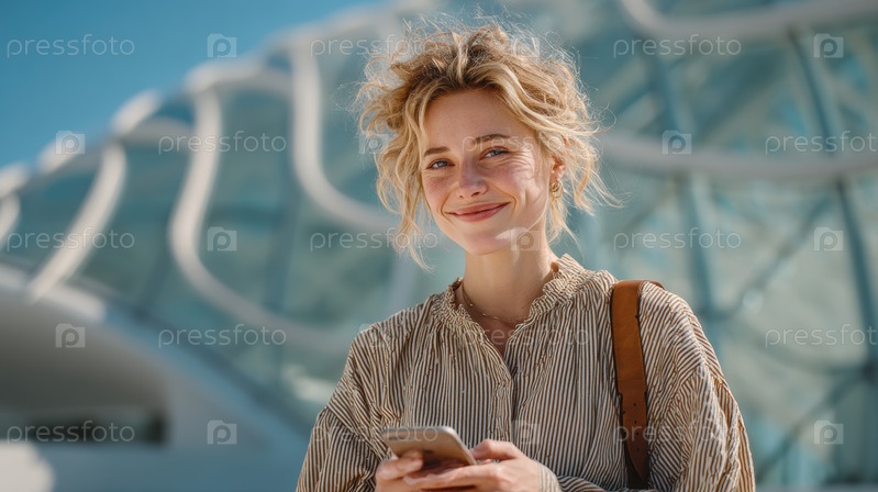 Улыбающаяся женщина с красивыми локонами и стильными солнцезащитными очками отдыхает на свежем воздухе со своим смартфоном в яркий солнечный день