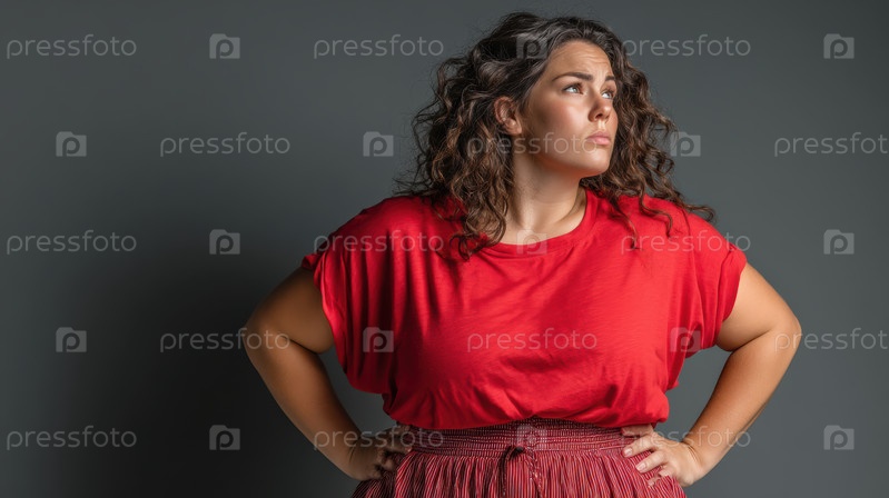 Стильная молодая женщина уверенно позирует в ярком, красочном наряде, который демонстрирует последние современные модные тенденции