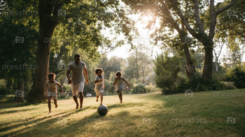 Увлекательный семейный опыт Дети с энтузиазмом играют в футбол в красивой солнечной среде