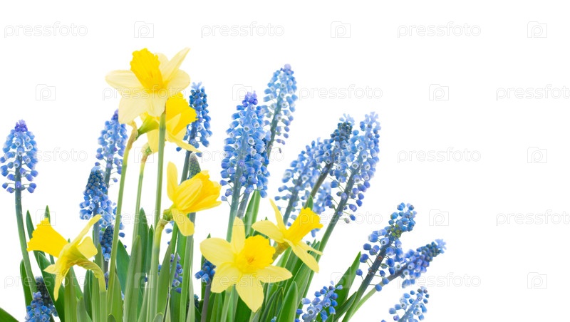 Цветы нарцисса и синих колокольчиков изолированы на белом фоне
