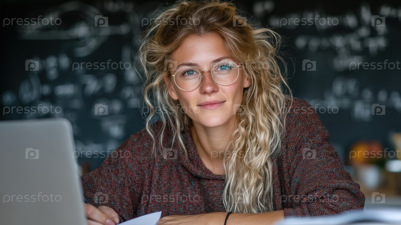 Уверенная в себе учительница держит бумаги в классе, заполненном математическими уравнениями вокруг нее