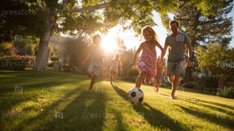 Увлекательный семейный опыт Дети с энтузиазмом играют в футбол в красивой солнечной среде