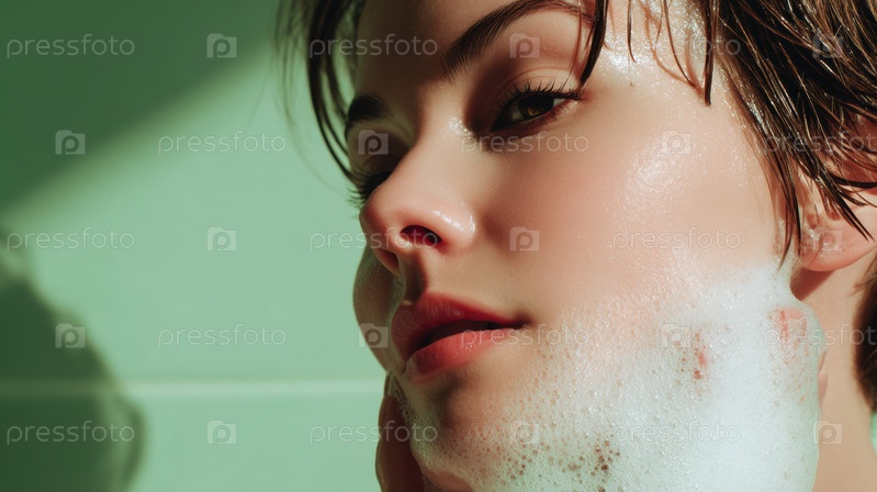 Красивая женщина аккуратно очищает свое лицо от пены на мягком зеленом фоне, выглядя спокойной и счастливой