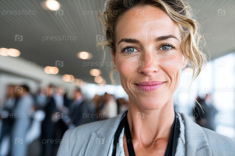 Спокойная деловая женщина в стильном костюме на сетевом мероприятии, с размытым фоном, добавляющим глубину