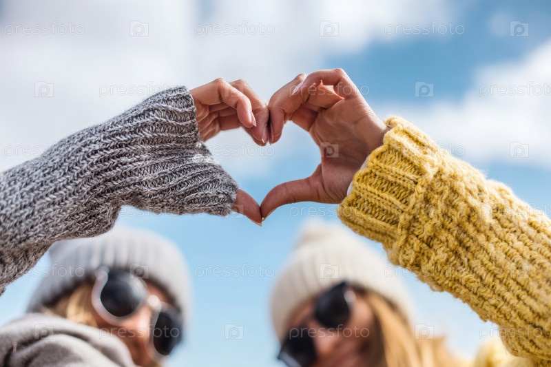 Две руки формируют форму сердца на фоне яркого неба, заполненного прекрасными облаками на заднем плане