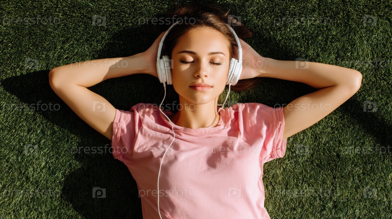 Молодая женщина лежит на мягкой зеленой траве, наслаждаясь ее музыкой и обнимает чувство спокойствия и расслабления