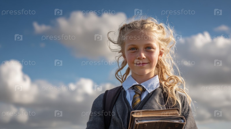 Молодая девушка держит кучу книг на фоне красивого и драматического неба