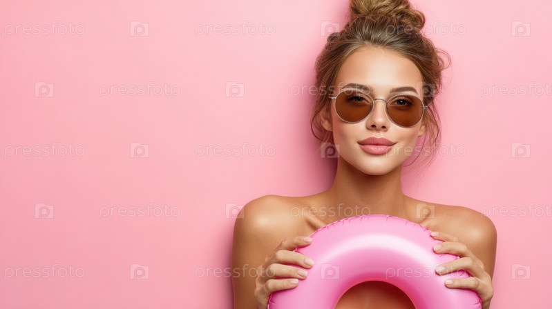 Веселая женщина нежно держащая розовый спасательный бум, обнимает яркие и солнечные летние вибрации, которые окружают ее