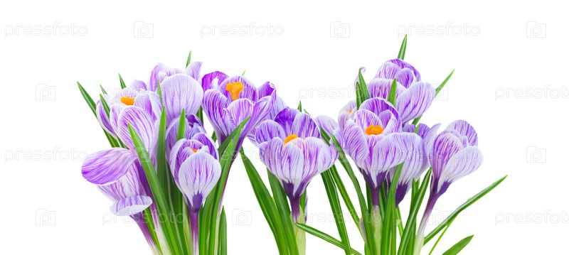 Близкая студия натюрморта показывает скопированные цветы крокуса с полосыстыми листьями, свежими зелеными листами и видимой пыльцой