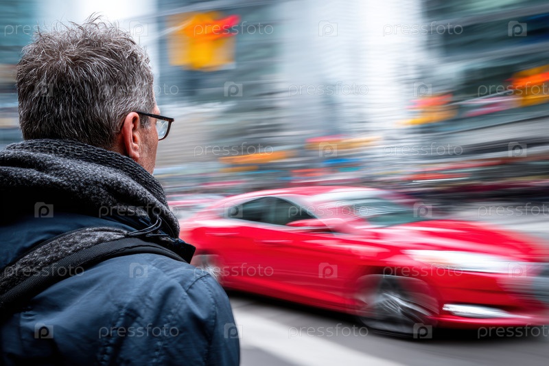 Зимняя городская сцена Человек гуляет по заснеженным улицам города, когда мимо него проезжает ярко-красная машина