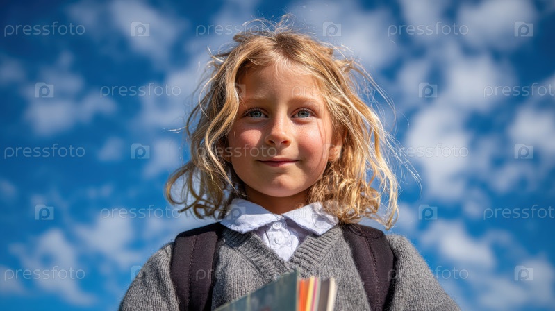 Молодая девушка сияет от радости, держа в руках кучу красочных книг и стоя под потрясающим небом, наполненным облаками