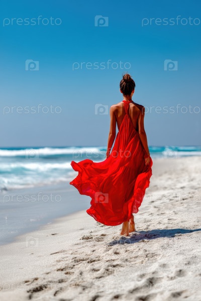 Элегантная женщина в красивом красном платье гуляет грациозно на пляже при восходе солнца, обнимая момент