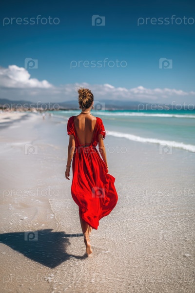 Успокоенная сцена показывает изящную женщину в текучем красном платье, которая элегантно идет по берегу океана