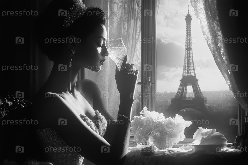Потрясающая невеста восхитительно наслаждается захватывающим видом на культовую Эйфелеву башню из элегантной комнаты