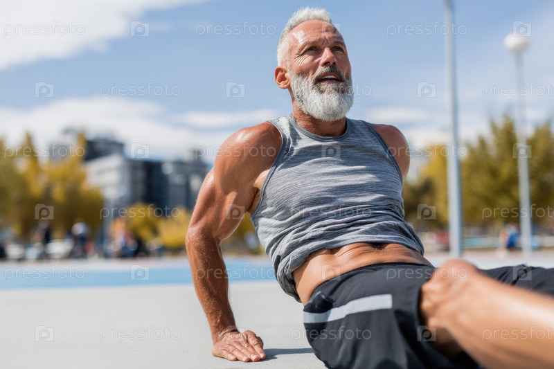 Мотивированный старший мужчина активно занимается спортом на свежем воздухе, нося при этом удобную и стильную спортивную одежду