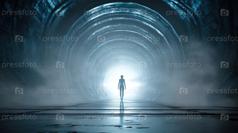 Таинственный силуэт стоит на дальнем конце светящегося тоннеля, вызывая чувства тайны и исследования